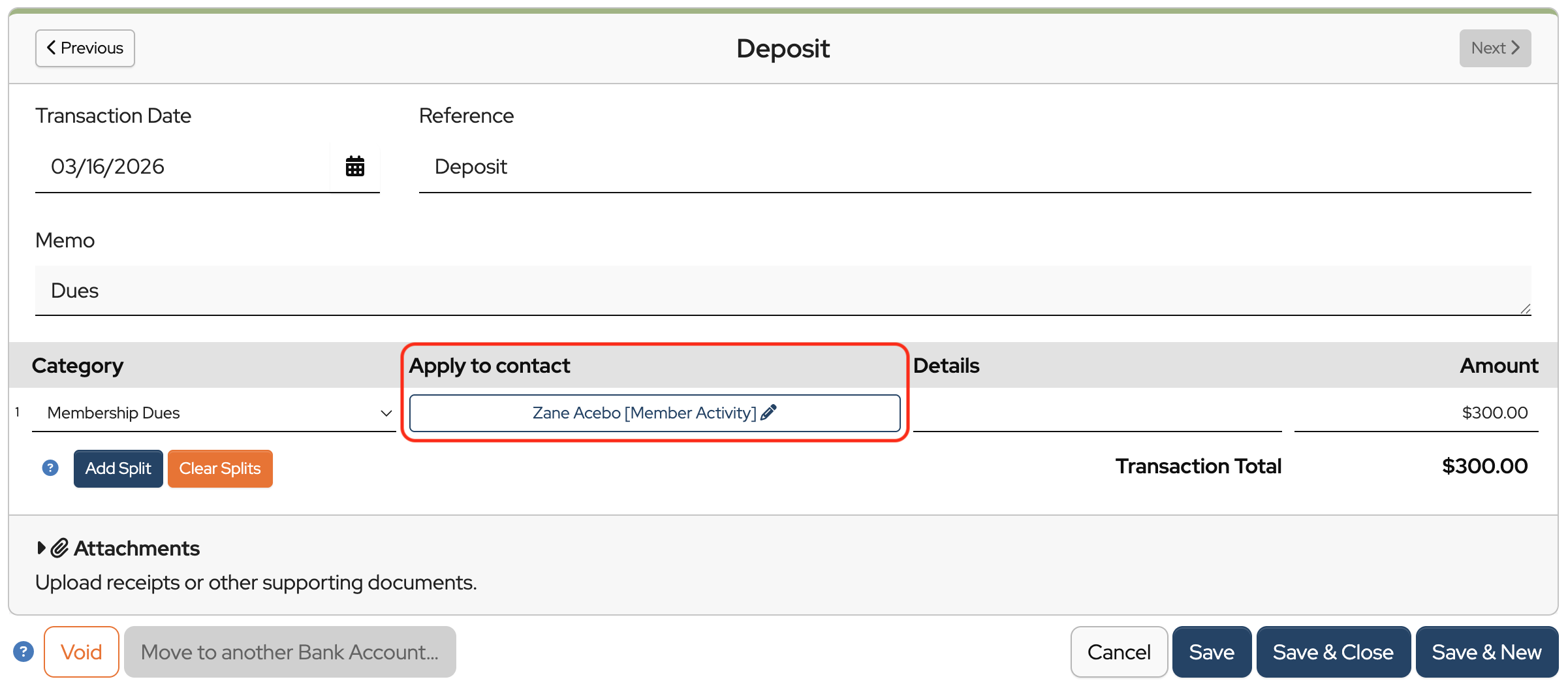 When a contact makes a payment—for example, for dues—you’ll record that payment as a deposit in the banking section and apply the payment to the contact.