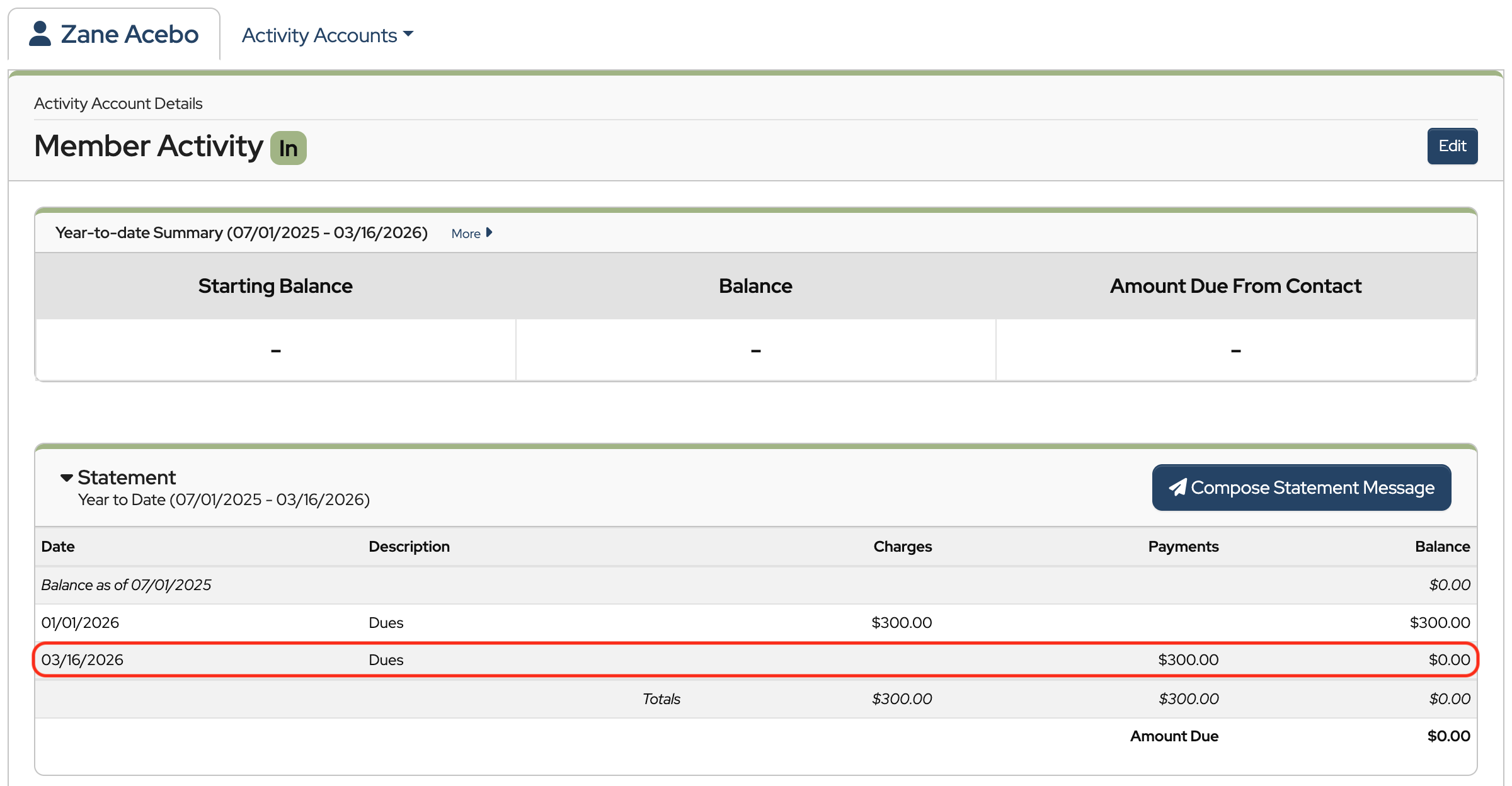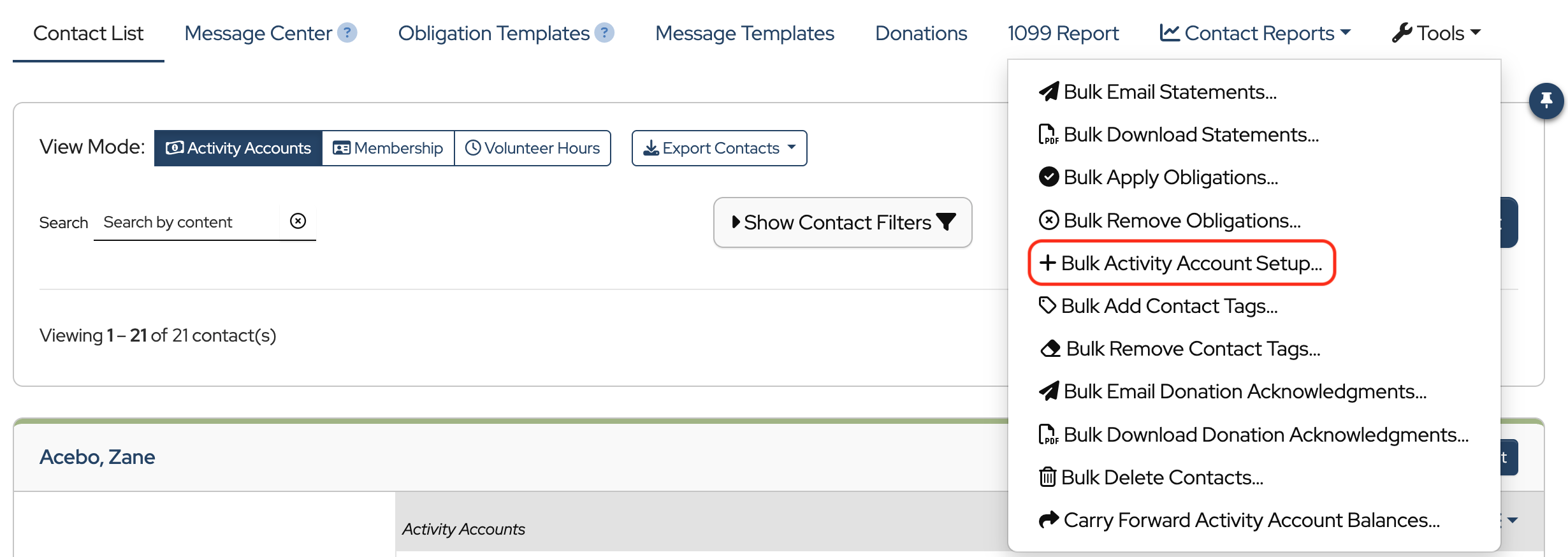 To track balances and send statements, each contact needs an Activity Account. This is where you’ll record charges and payments and view each contact’s balance history.