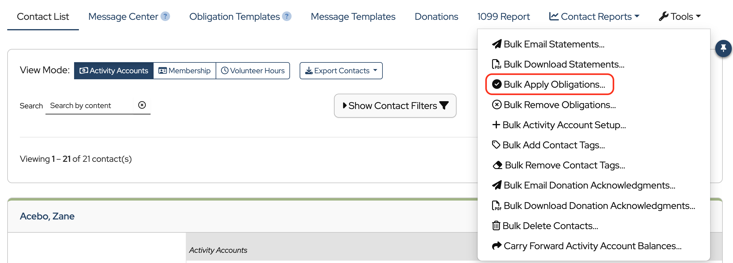 Just like Activity Accounts, Obligation Templates can be applied individually or in bulk.