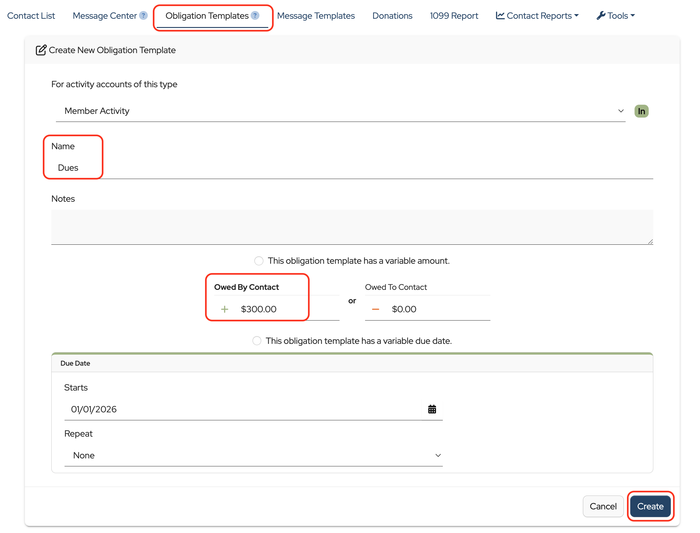For example, if you’re collecting dues, you’d create a Dues Obligation Template with the amount owed.
