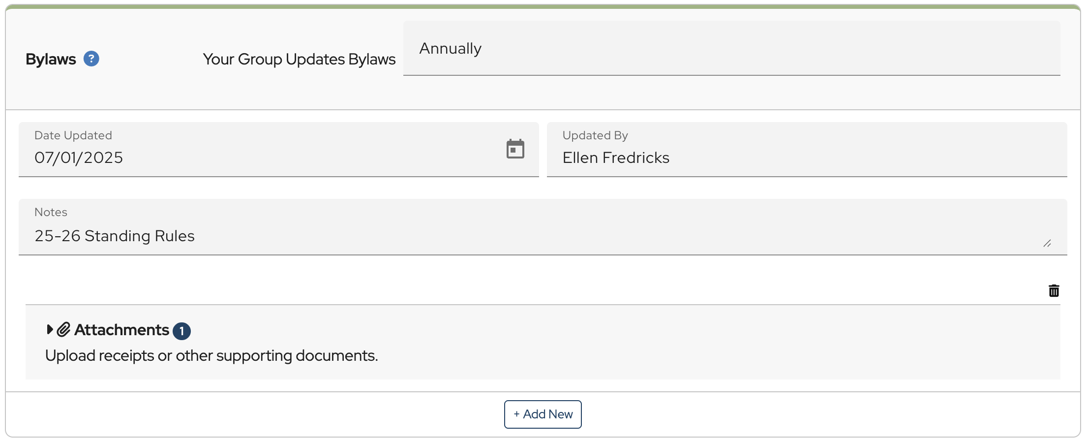 Enter when the bylaws were updated and by who. A copy of the bylaws can be uploaded here as well.