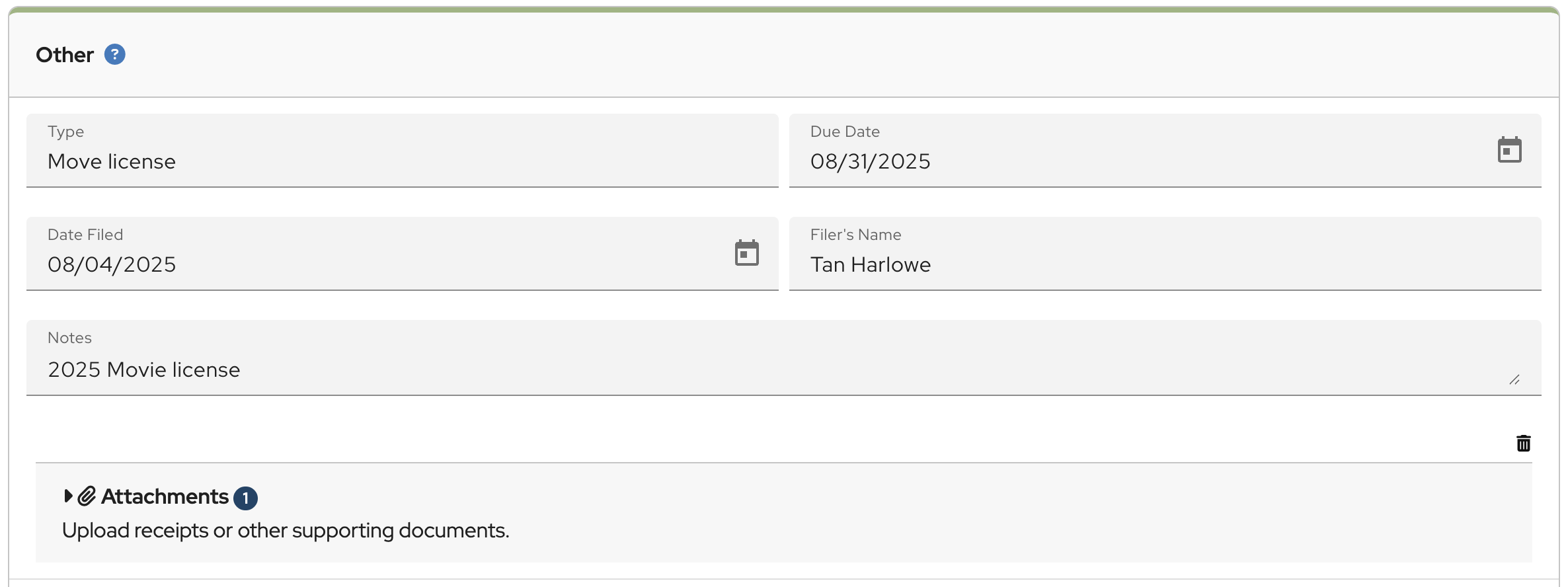 The Other section can be used for any other licensing or filings you want to track such as movie license, charitable solicitation license, gaming license, etc. These documents can be uploaded and stored here.