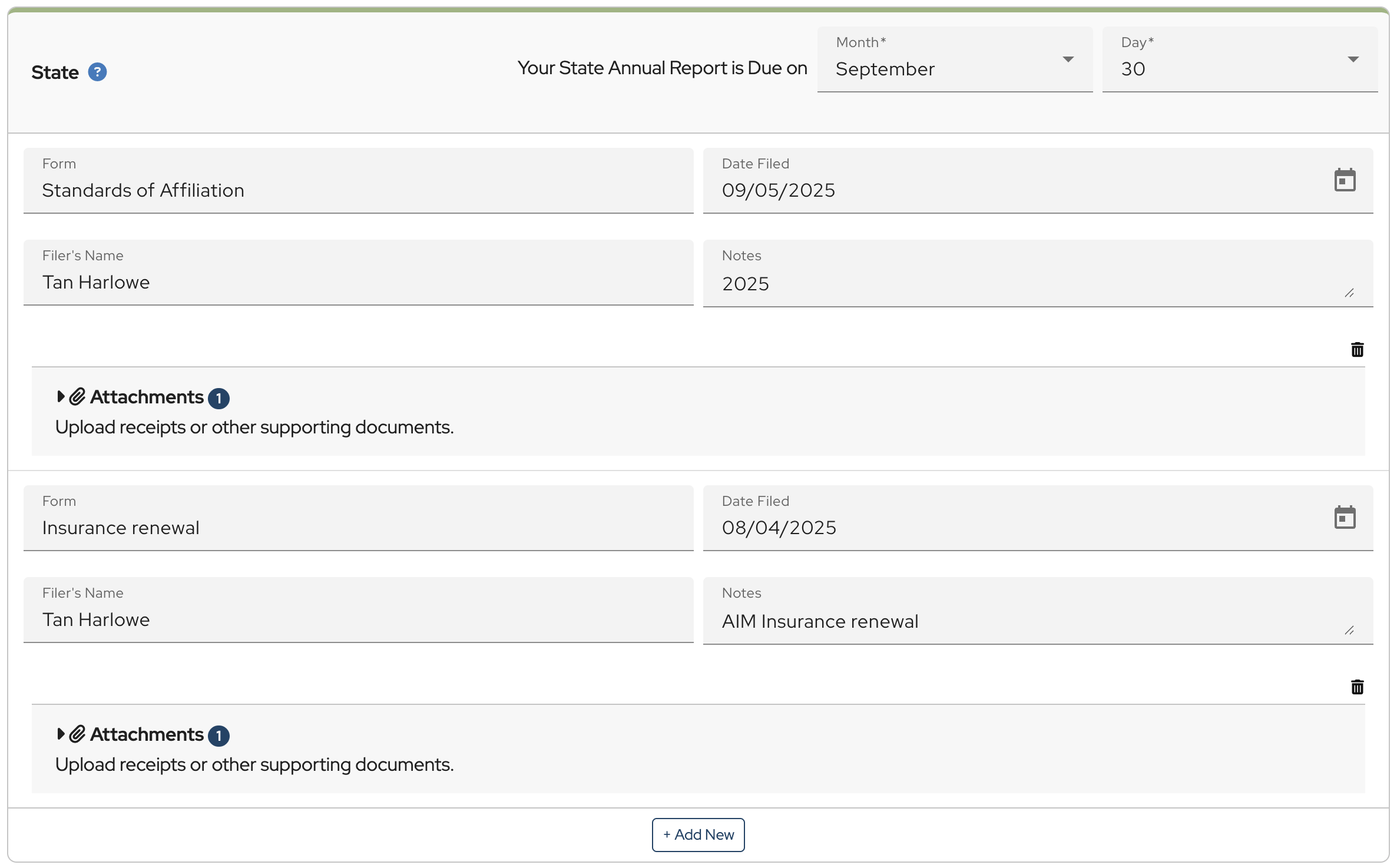 U.S. nonprofits must file with their state through specific requirements outlined by each Secretary of State. Input the due date to help you keep track. The State section is a great place to keep these records.