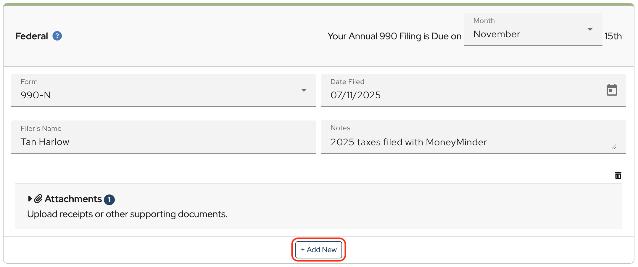 The Federal section allows you to keep track of your federal tax filing due date, which 990 form was filed, the date it was filed, the filer’s name, and any notes. You can also upload a copy of the filed form here.